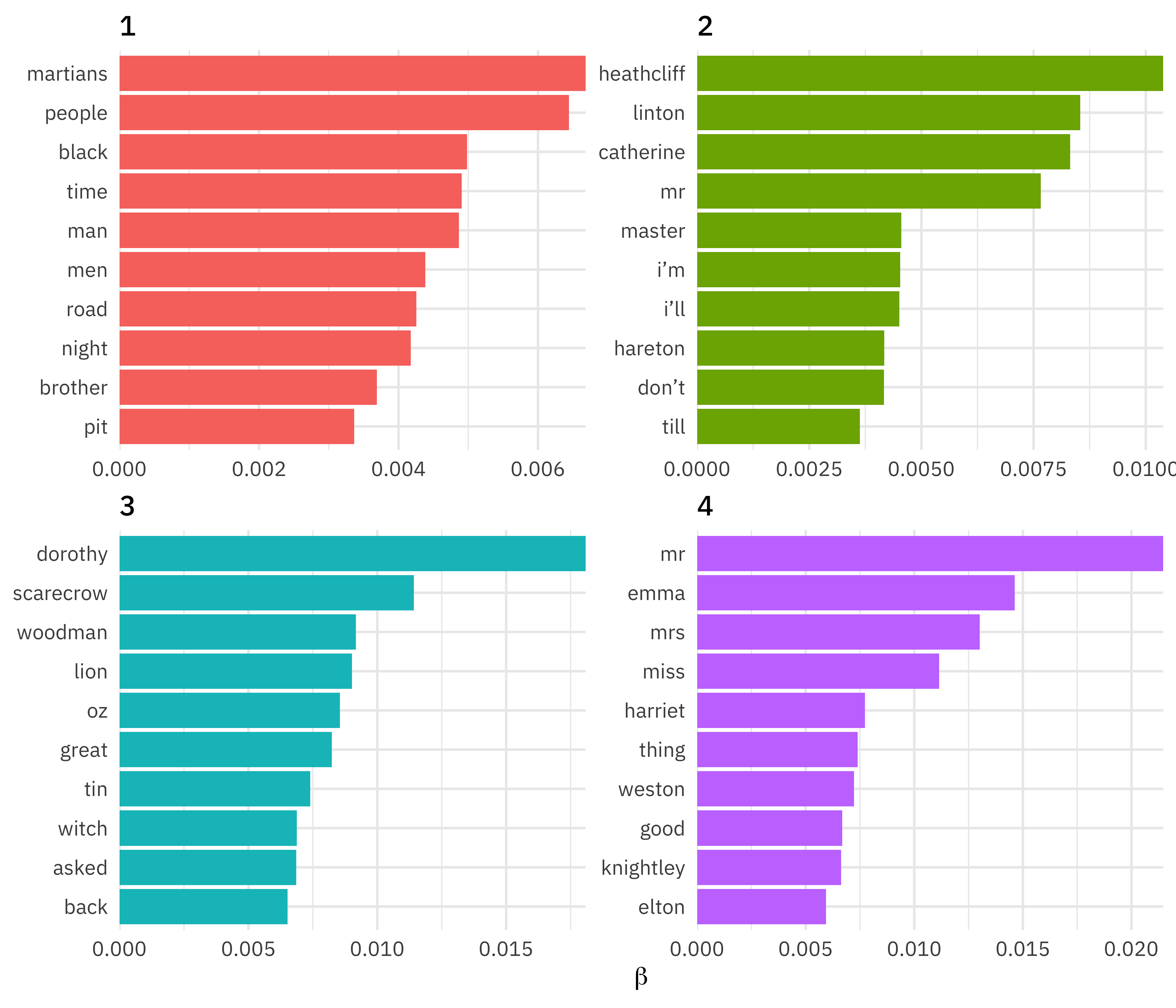 #> Score: emma, harriet, weston, knightley, elton, jane, mrchapter_topics <- tidy(topic_model, matrix = "beta")