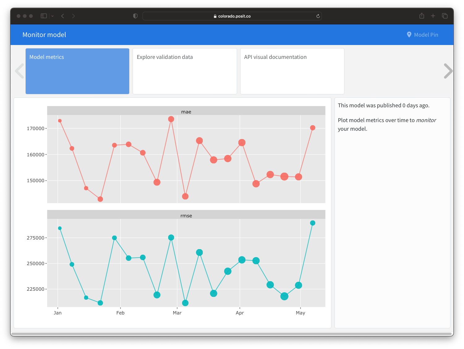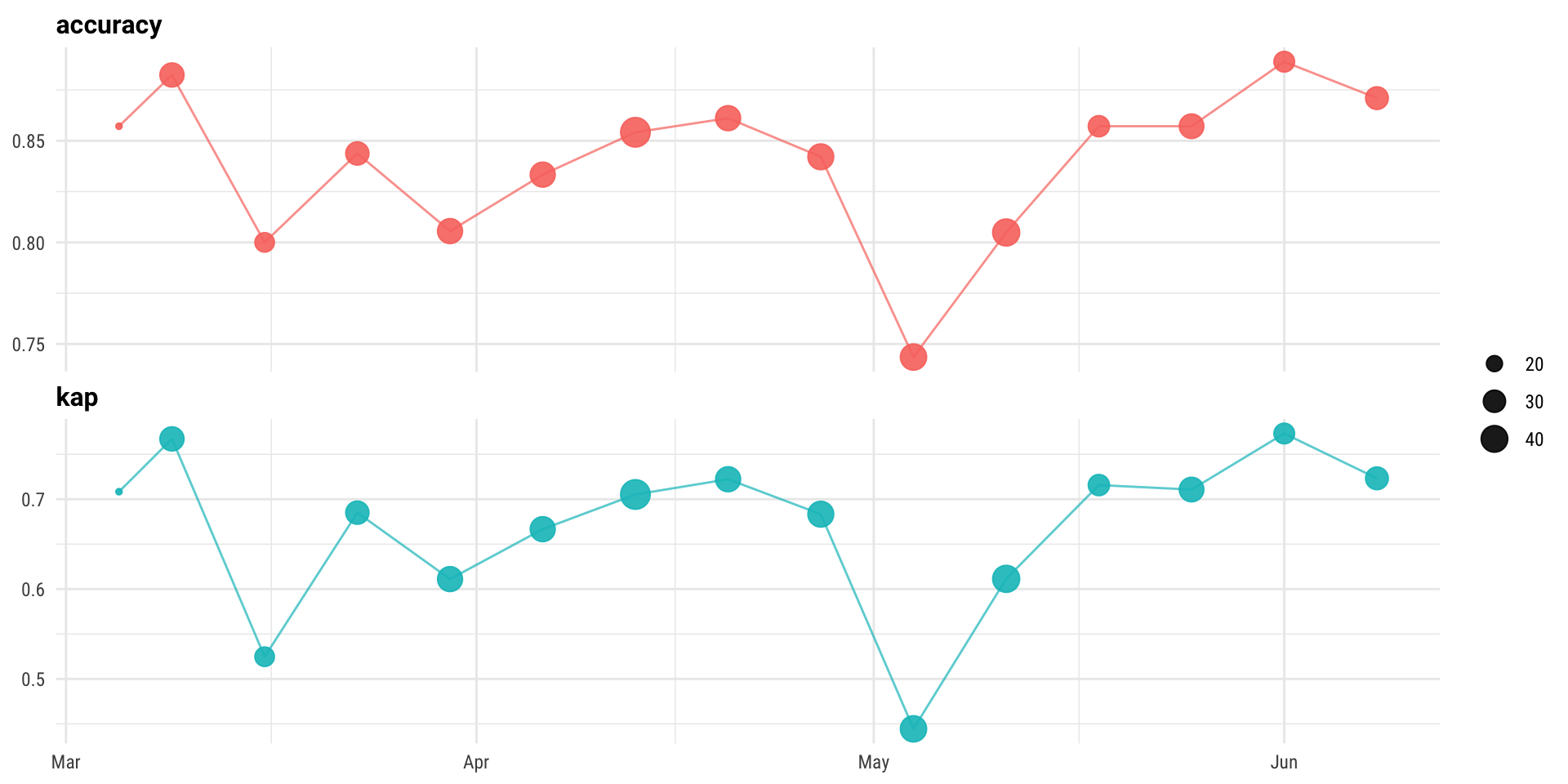 library(vetiver) laundry_service_monitoring |> vetiver_compute_metrics(date, "week", customer, .pred) #> # A tibble: 30 × 5 #> .index .n .metric .estimator .estimate #> <date> <int> <chr> <chr> <dbl> #> 1 2023-03-05 14 accuracy binary 0.857 #> 2 2023-03-05 14 kap binary 0.708 #> 3 2023-03-09 34 accuracy binary 0.882 #> 4 2023-03-09 34 kap binary 0.767 #> 5 2023-03-16 25 accuracy binary 0.8 #> 6 2023-03-16 25 kap binary 0.525 #> 7 2023-03-23 32 accuracy binary 0.844 #> 8 2023-03-23 32 kap binary 0.685 #> 9 2023-03-30 36 accuracy binary 0.806 #> 10 2023-03-30 36 kap binary 0.611 #> # ℹ 20 more rows