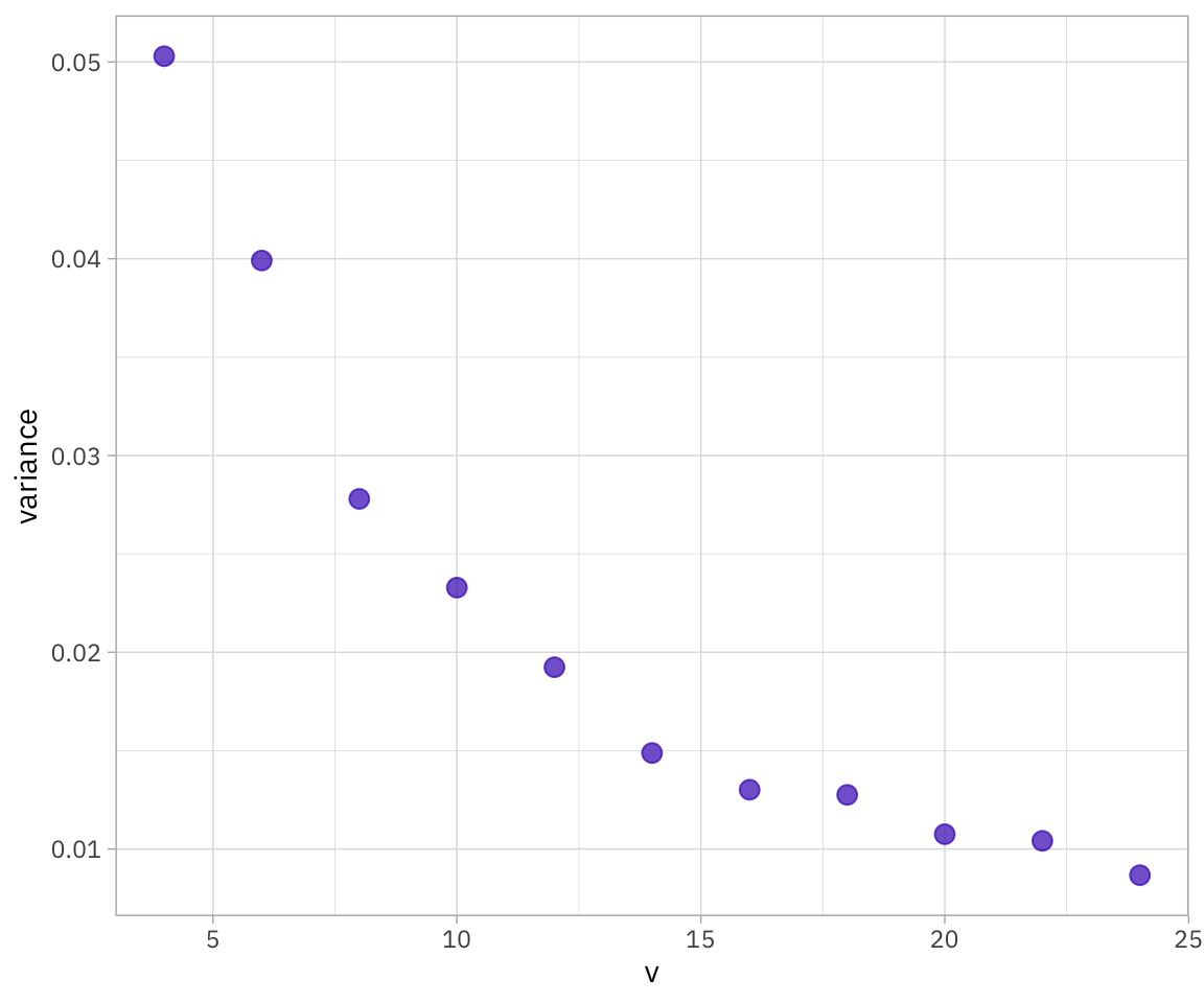 tibble(v = rep(seq(4, 24, by = 2), 100)) %>%